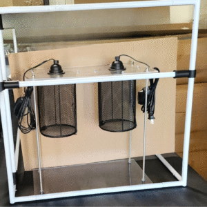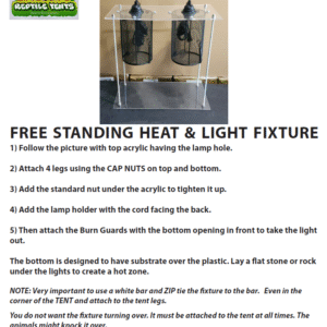 These free-standing heat/light domes are 16″ high x 16″ wide. The burn guards in these units are 8″ high x 5″ wide. The unit contains two “dimmer-controlled” socket with a maximum rating of 150 watts. The bottom acrylic is designed to allow a “Flat Rock” to lay on the plastic; the heat from above will provide a hot zone. NOTE: We DO NOT recommend using a Ceramic Heat Emitter (CHE) that is over 100 watts. Always check the temperature under the heat source using a temp gun and never let temperatures go over 120°F. Always use a thermostat.